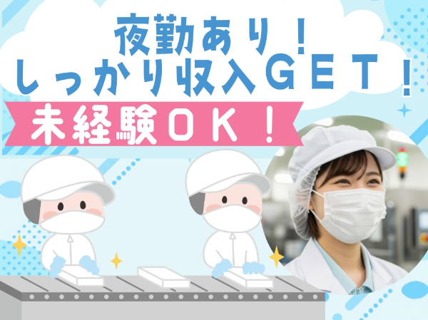 | 選考について | 1. Web応募(たった1分で完了!) ※名前・生年月日など簡単な項目のみ ※履歴書登録は不要です 2. 面接(Web面接や工場見学も可能) ※応募~お仕事決定まで約2週間程度 |